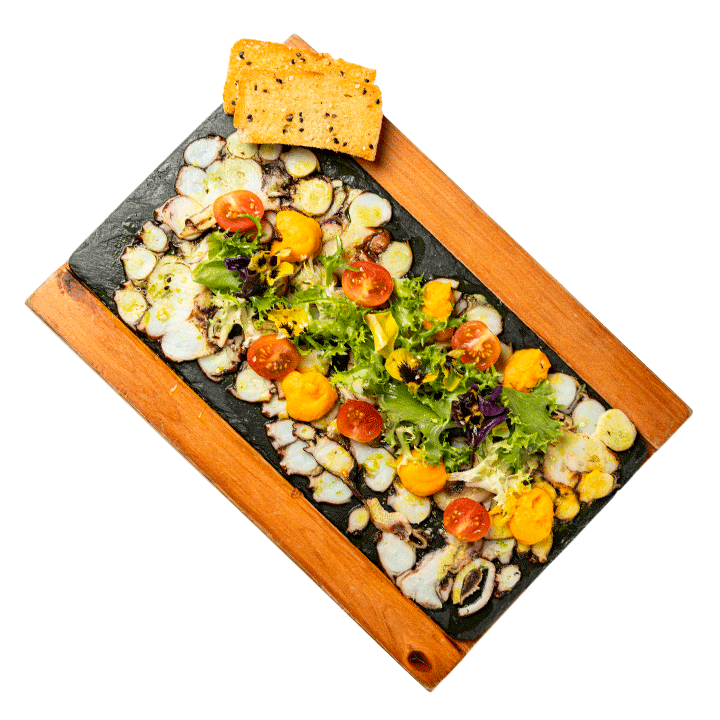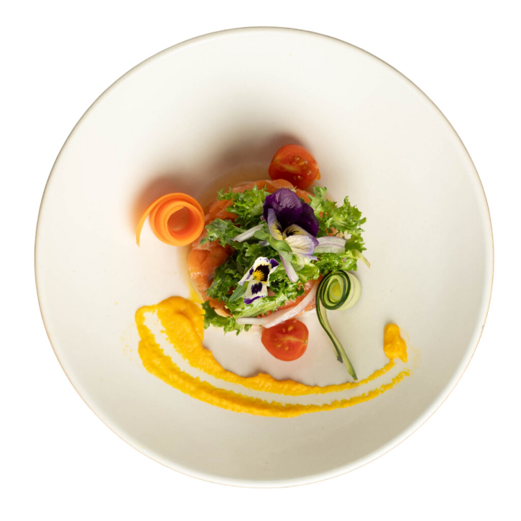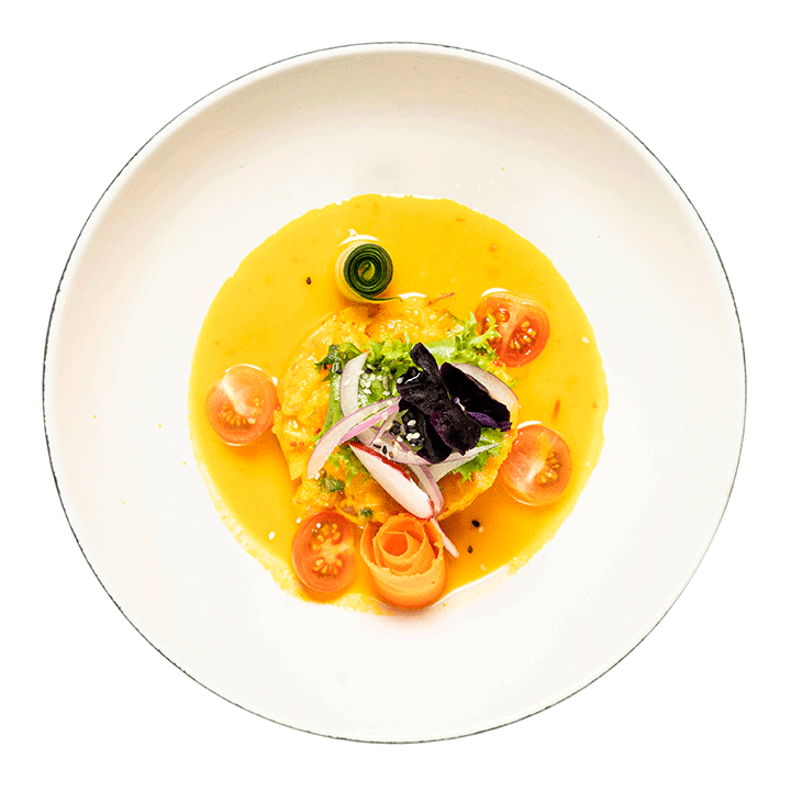 Passion fruit ceviche, coconut milk and a touch of spice.