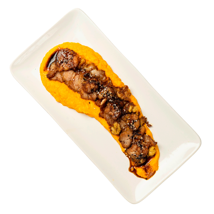 Accompanied with mashed carrots, red wine and spanish sauce.