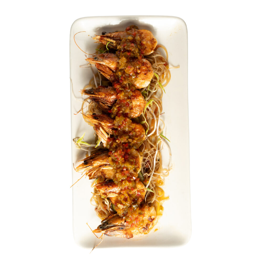 Grilled shrimps served with a harusame noodle salad and Thai sauce.